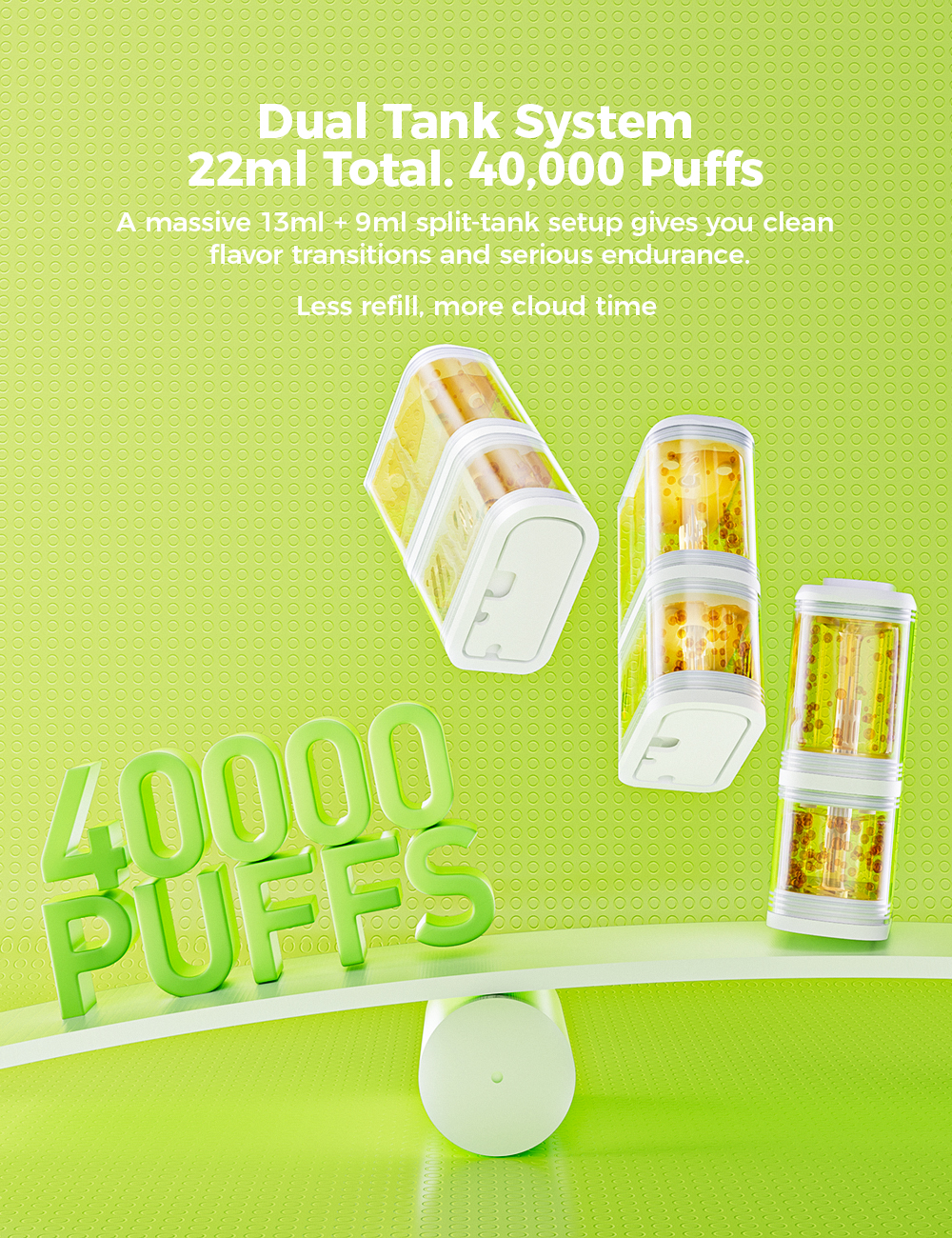 • Dvojitá nádrž (22 ml celkem) – Rozděleno na 13 ml + 9 ml pro lepší oddělení chutí a delší výdrž.