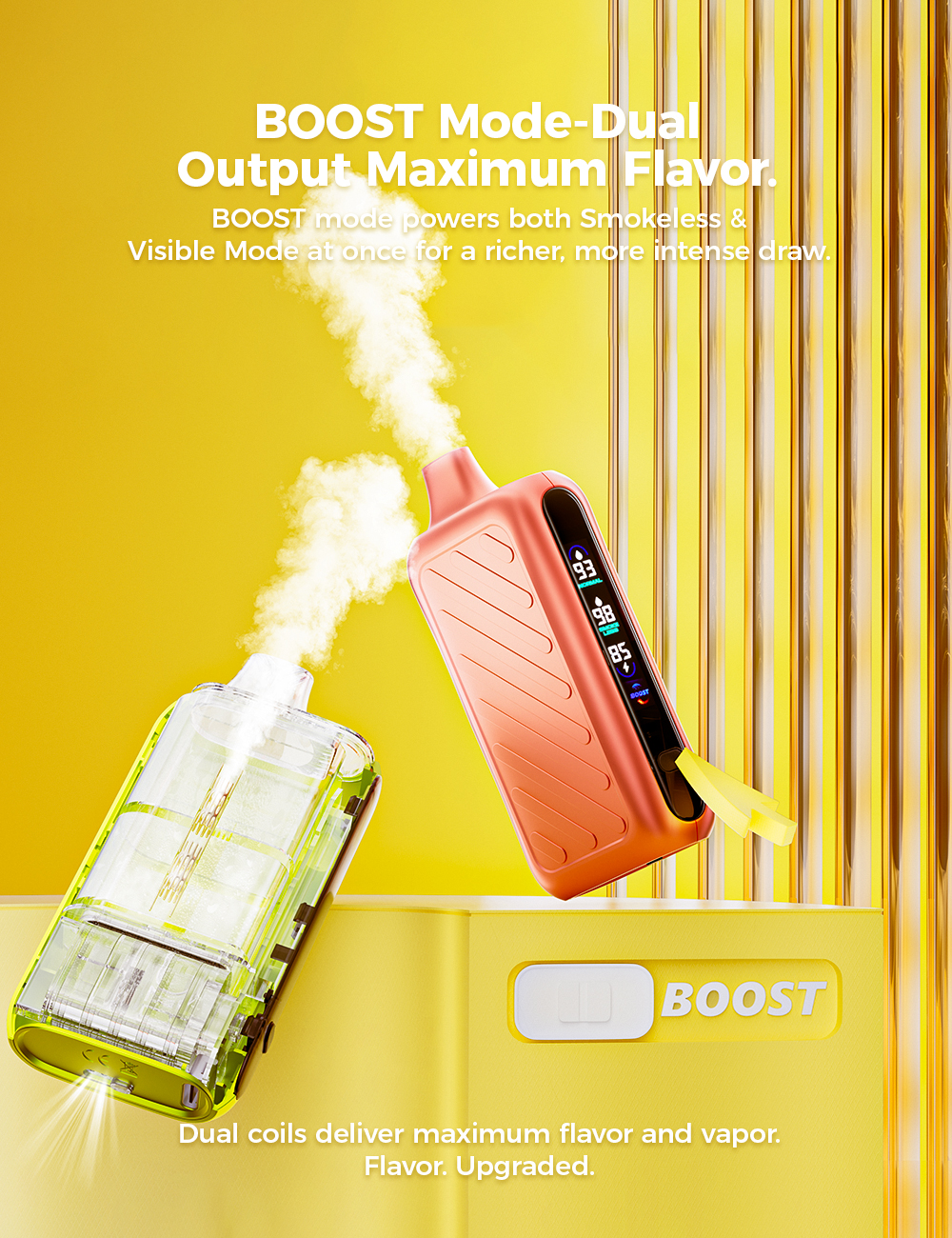 • Režim Boost – Dvojitý výkon – Pohání jak režim Smokeless, tak viditelnou páru pro maximum chutí a dýmu.